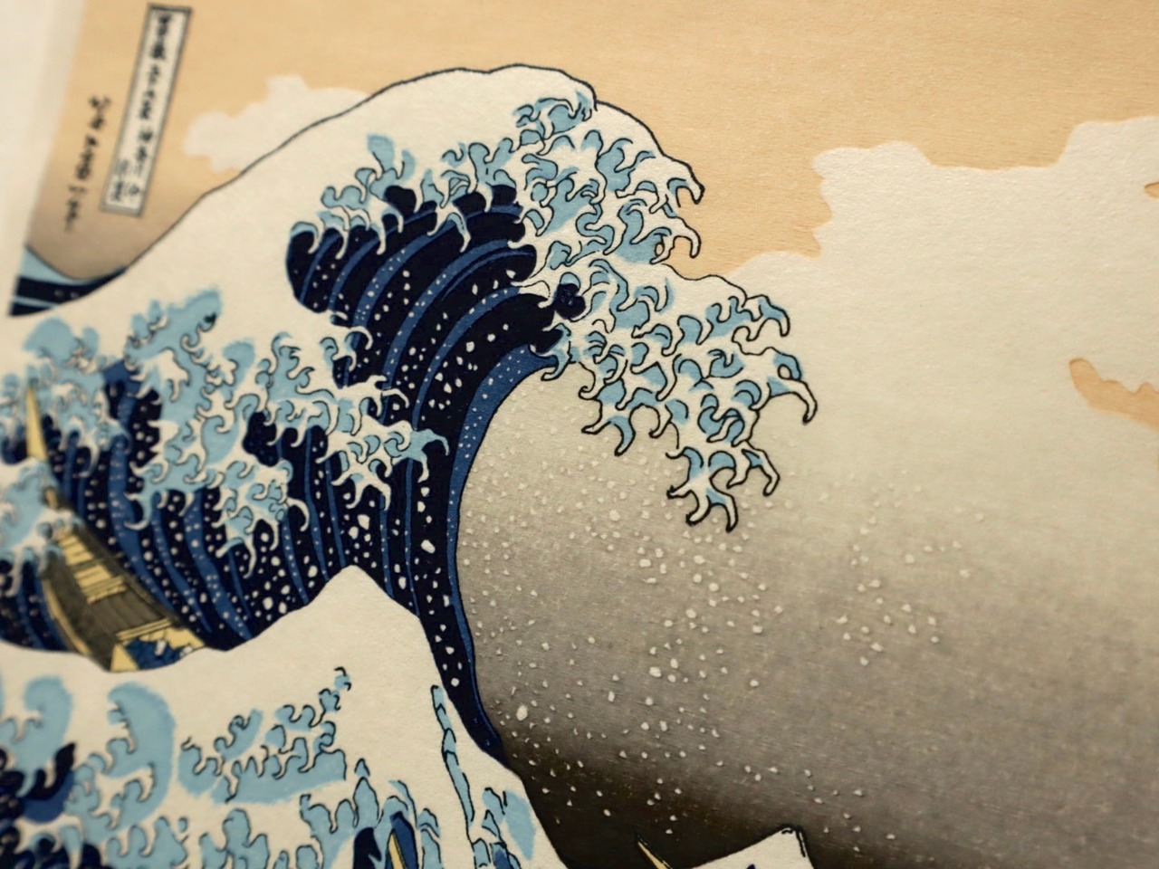 巨大な波が飛沫をあげながら、今まさにくだけ落ちようとしており、小舟は襲いかかる波濤にこらえて航行を潮流にまかせているかに見えます。