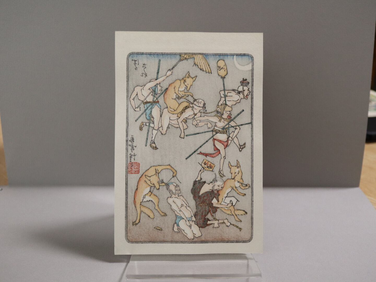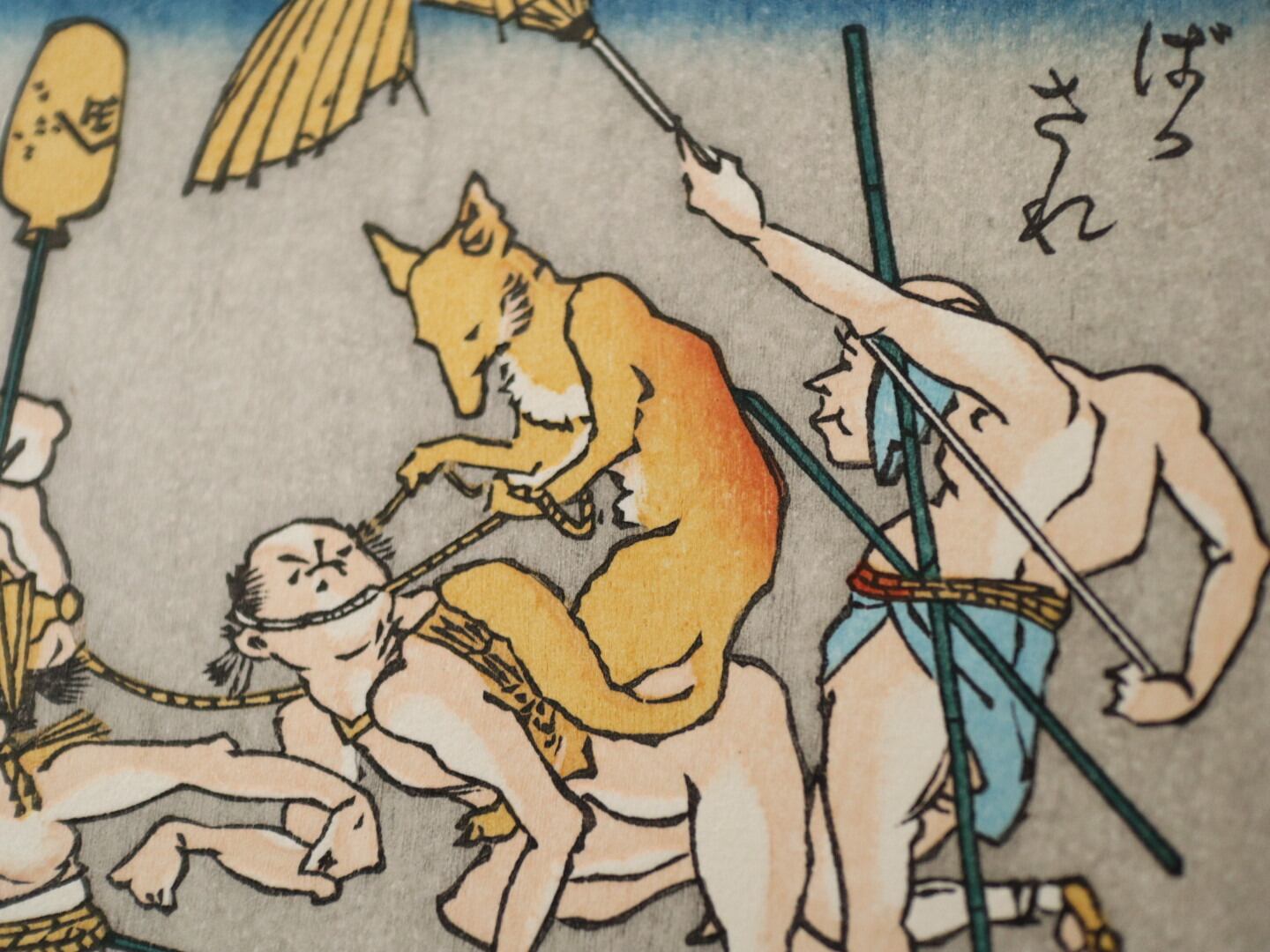 「ばかされ」。狐に化かされる男たち。化かされて馬になった男は狐を乗せ、 馬の口取りが手綱を持ち、付き人のつもりの男は大傘と思って破れ傘をさし かけ、その前は奴になったつもりの男が露払いを務めます。下段では、髪結 いに化けた狐に直してもらう男や初午で奉納された小絵馬を合せ鏡と思い込 み、髪形を確認する男。いずれも滑稽な姿です。
